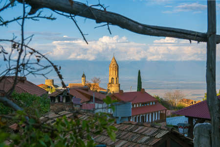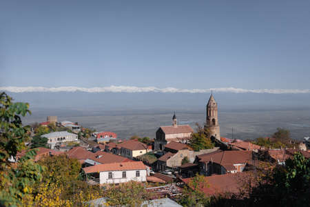 Sighnaghi near the Caucasus Mountains in Georgia, a church with a bell tower, buildings and roofs, as well as mountain ranges. Beautiful view of Alazani Valley top view place for text Sunny day with blue sky and white clouds
