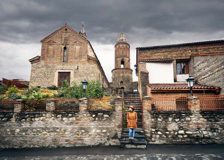 Old Church with tower in Signagi town at grey cloudy sky and woman in hat out of focus in Georgia