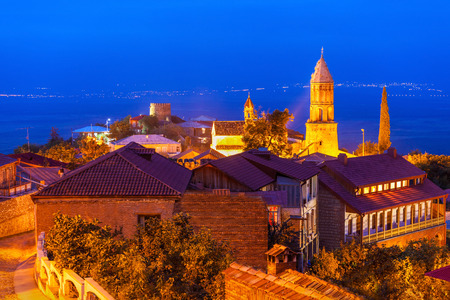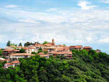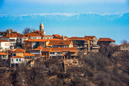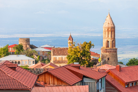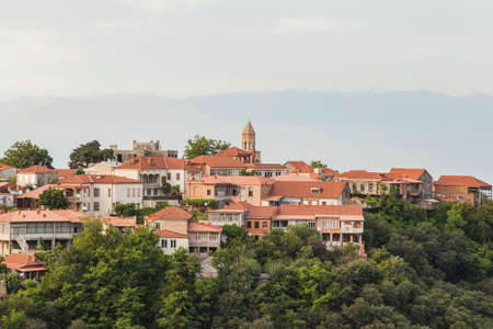 View of houses and old church in Signagi or Sighnaghi city in mountains at Kakheti region. Georgia