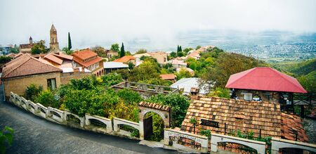 Sighnaghi village landscape and city view in Kakheti, Georgia. Old houses beautiful view during mist and fog
