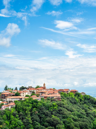 blue sky with white clouds over Sighnaghi town on top of mount in Alazani valley in summer morning, Georgia