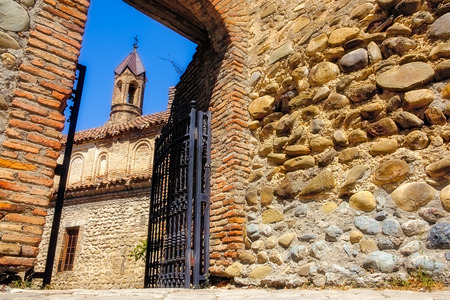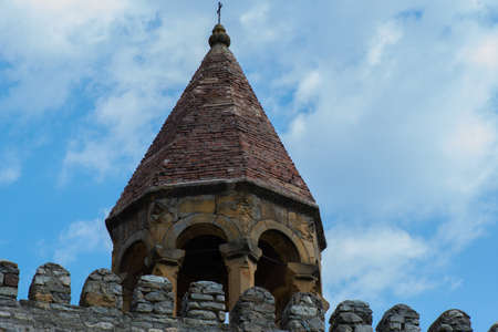 Detail of Sighnaghi church tower framed in ancient stone wall, Country of Georgia