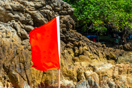 Red flag on the beach. Flag prohibiting swim