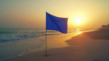 A serene beach scene featuring a blue flag gently waving in the breeze at sunrise. Soft waves lap at the sandy shore, creating a tranquil atmosphere.