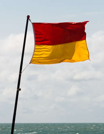 Red and yellow warning flag on the beach close up