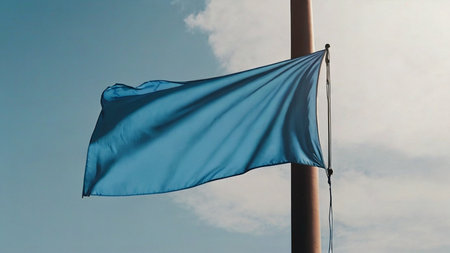 A vibrant red flag flutters under a cumulus cloud in the electric blue sky amidst the vast expanse of liquid water, signaling a warning to travelers of potential danger ahead AIG50
