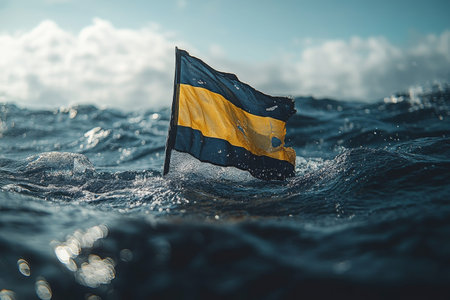 Torn flag floats ocean waves; stormy sky background; nautical distress signal