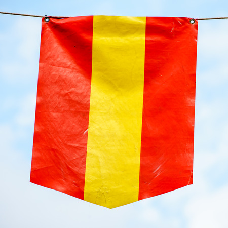 Front view of Spanish pennant on rope on sky background.