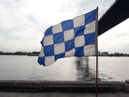 symbol of military fleet flies white flag with blue cross on wind against sky and sea