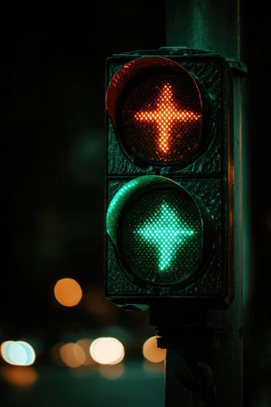 A detailed image of a traffic light shows both red and green illuminated signals. The composition focuses on the lights against a dark background, highlighting the contrast. The visual style features clear, modern aesthetics, and the image may be used in commercial projects or editorial content.