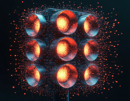 A futuristic red traffic light equipped with AI technology that uses realtime data to adjust its timing and keep traffic moving smoothly