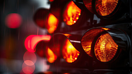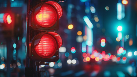 close-up of red traffic light, with the view in the background blurred and unclear, created with generative ai
