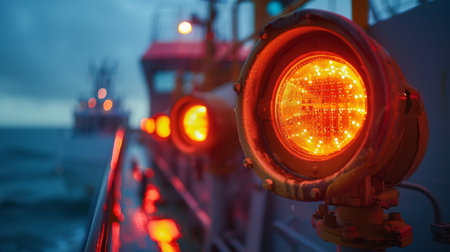 A row of red lights are lit up on a boat. The lights are bright and glowing, creating a sense of excitement and energy. The scene is set on a body of water, with the lights reflecting off the surface
