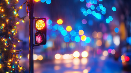 Traffic Light Showing Red and Orange Signal Against Background of Blurry Christmas Lights