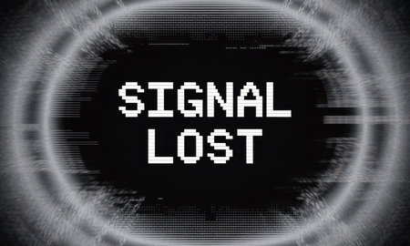 Pixelated SIGNAL LOST text on a black screen with analog television static, digital glitch effect, and concentric noise patterns, indicating a broadcast interruption or error.