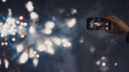 Hands holding smartphones to photograph colorful fireworks in a festive, illuminated night sky