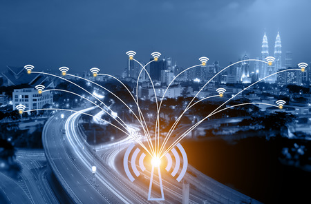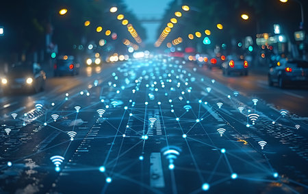 Network connection, data flow, urban setting, glowing lines, night traffic, technology concept, business, communication.