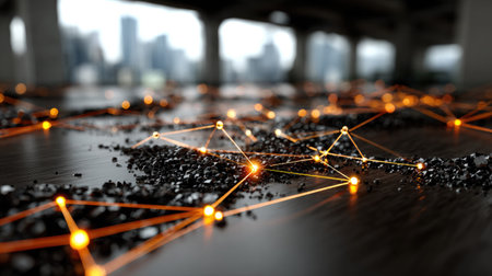 An abstract depiction of a network connecting glowing nodes across a textured floor, featuring an urban background and soft focus, symbolizing technology.