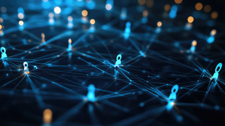 A digital-themed network concept with glowing lines connecting nodes represented by colorful pins.