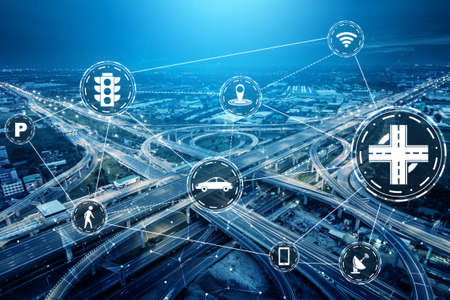 Smart transport technology concept for future car traffic on road . Virtual intelligent system makes digital information analysis to connect data of vehicle on city street . Futuristic innovation .