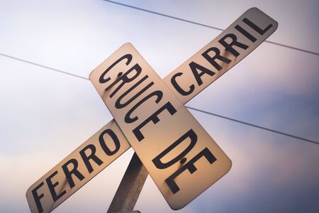Photograph of a railroad crossing sign in spanish