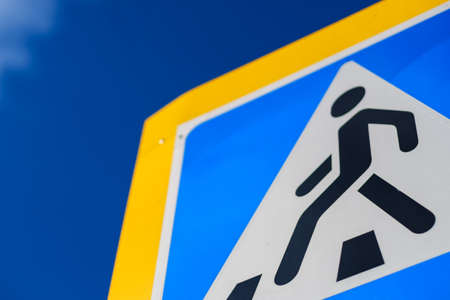 Pedestrian crossing traffic sign. Blue sign with a white triangle and a man crossing the street.