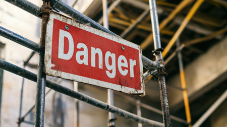 Red Danger Sign Attached to Metal Scaffolding at a Construction Site. High quality photo
