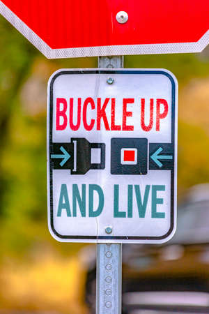 Buckle Up And Live road sign on a sunny street