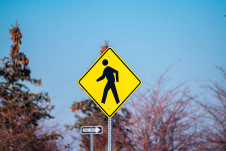 Traffic yellow warning sign on a pole for a pedestrian crossing against a blue sky with trees
