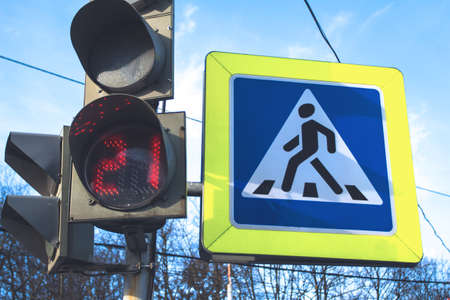 crosswalk sign blue warning pedestrian road crossing. symbol.