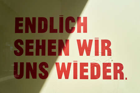 Sign on a shop window with the words finally we meet again