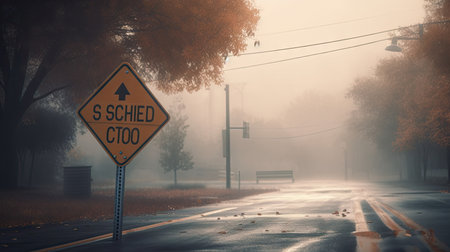 A yellow road sign stands in middle of flooded road, reflecting in water under moody sky. scene captures impact of heavy rain and rising water levels