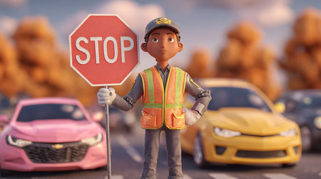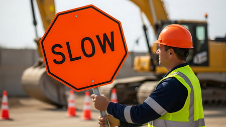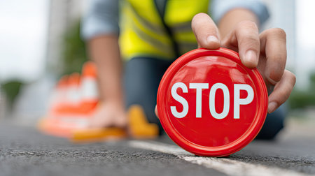 A construction worker places a vibrant stop sign on the road, symbolizing safety and caution at a job site. The bright colors enhance visibility for passing vehicles.