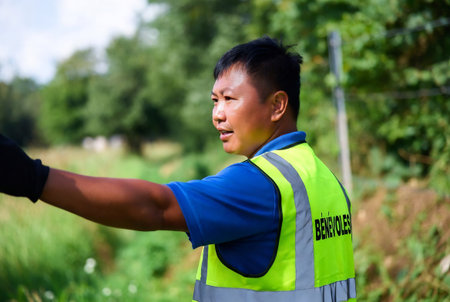 Back view of a man in yellow reflective vest waving his hand at the airport.