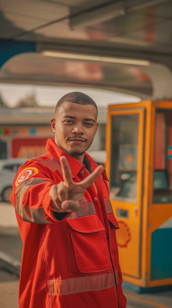 Smiling airport worker signaling in a high-visibility vest, conveying positivity and teamwork in a busy terminal environment.