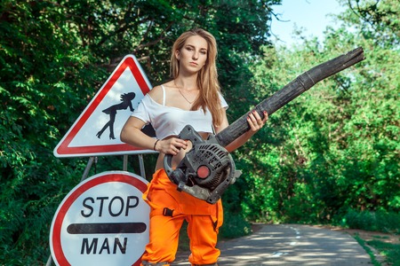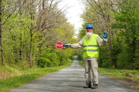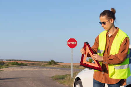 Man on sunglasses setting down red warning triangle in the middle of the road in the countryside and stop sign behind