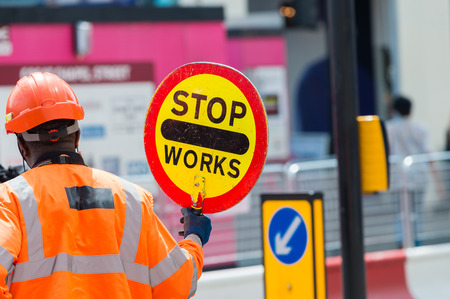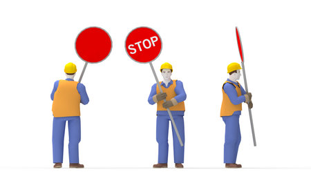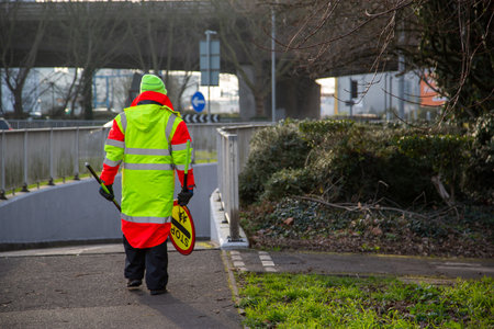 Close-up and rear view of a male road construction worker holding a stop stick, wearing high visibility protective clothing, road work management