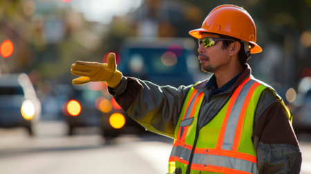 A construction worker wearing a reflective safety vest and a bright orange hard hat directs traffic keeping pedestrians and vehicles safe