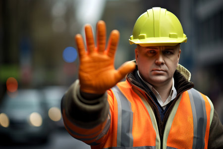 A construction worker in protective gear raises a hand to signal a stop on the site. Generative AI.
