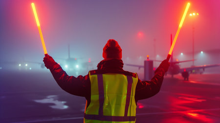 Dynamic action shot of an aircraft marshaller using glowing batons to guide a plane at a night airport. Neon lights and reflections create a vibrant and energetic atmosphere.