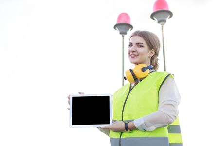Blured sky and red signal lights on background, young pretty brunette caucasian woman in green west and yellow earmuffs stand on roof and show empty tablet, smiling