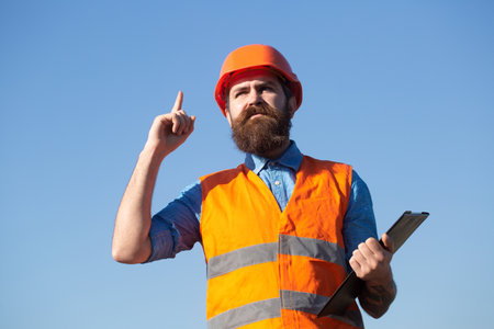 Builder in helmet on construction site. Construction engineer worker in builder uniform on construction. Portrait of builder ready to build new house. Builder in hardhat at construction site.