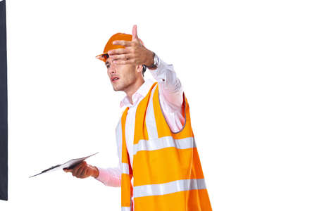 Worker in uniform gesturing stop. Serious worker with stop road sign. Builder with stop gesture, no hand, dangerous on building concept. Man in helmet showing stop road sign.