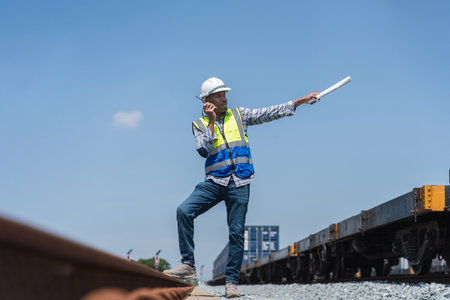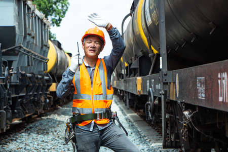 Inspector Engineering wearing helmet and vest worker unifrom checking railway construction work on rail track. Asian workers are using a walkie talkie to coordinate.
