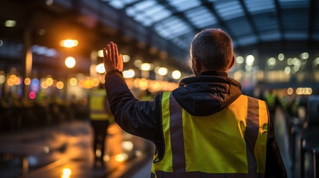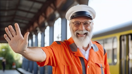 Train conductor signaling departure, red cap, blurred background. ai generated