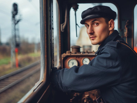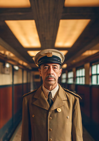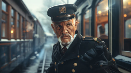 A man dressed in a conductor uniform stands proudly at a train station, ready for his duties