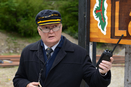 Summerland, British Columbia/Canada - May 14, 2017: the conductor takes tickets from passengers on the Kettle Valley Steam Railway, a popular tourist attraction in the Okanagan.