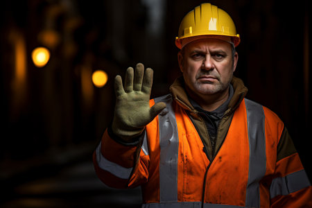 A construction worker in protective gear raises a hand to signal a stop on the site. Generative AI.