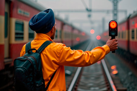 Railway worker with a backpack and turban holding a red signal on train tracks.