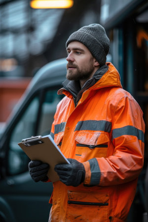 A construction worker in an orange safety vest and hard hat stands by the railway tracks, observing the surroundings while using a communication device thoughtfully.
